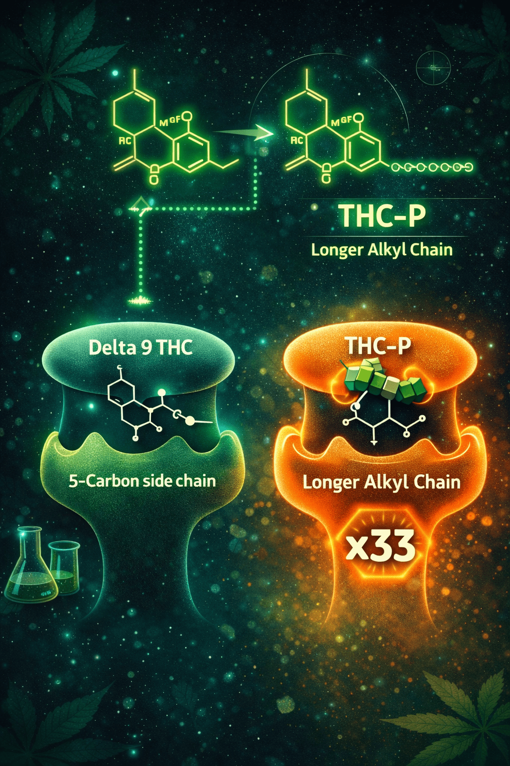 Standard delta 9 THC has a 5-carbon side chain. THC-P has a 7-carbon side chain. That extra length dramatically increases how well it fits into and activates your body’s CB1 receptors — the receptors most associated with the psychoactive effects of cannabis. According to the researchers who discovered it, THC-P may bind to CB1 receptors up to 33 times more effectively than conventional delta 9 THC.